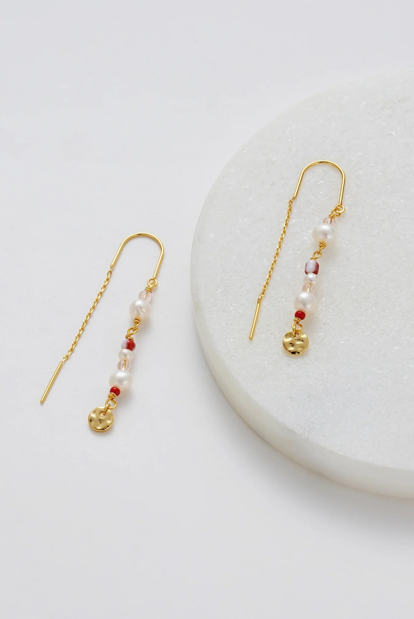 The Alice Thread Earrings bring a soft pop of colour to your ear stack. Designed in a delicate thread-through style, they feature a mix of freshwater pearls, blue or pink beads, and a gold hammered disk charm for a touch of texture. Lightweight and elegant, they add effortless movement and beach-inspired colour to any look.Â