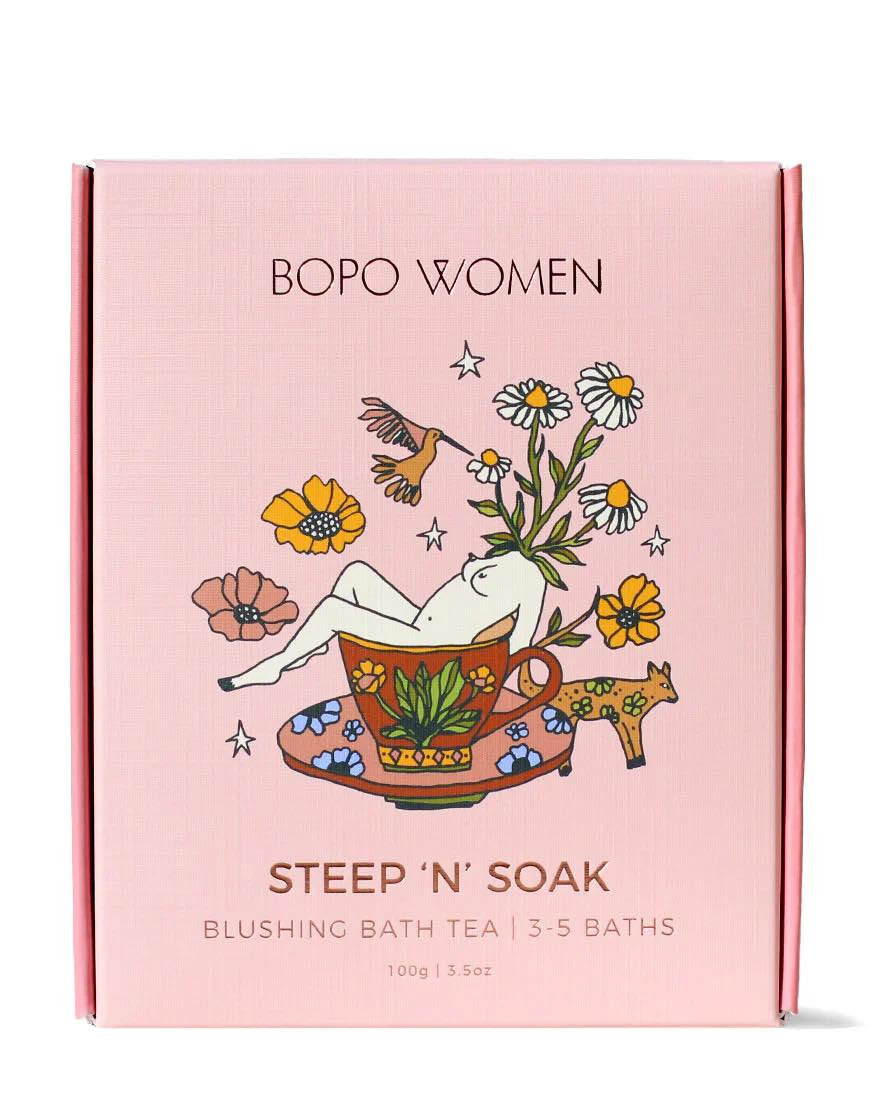Indulge in the ultimate self-care ritual with BOPO's Steep 'N' Soak Blushing Bath Tea. Designed to transform your bath into a luxurious botanical retreat, this blend of soothing dried flowers, hydrating rolled oats, creamy coconut milk powder, and skin-loving beetroot and hibiscus powders nourishes your skin while you unwind. Infused with a decadent, all-natural essential oil blend, each soak soothes muscles while it's calming aroma leaves you feeling deeply restored.